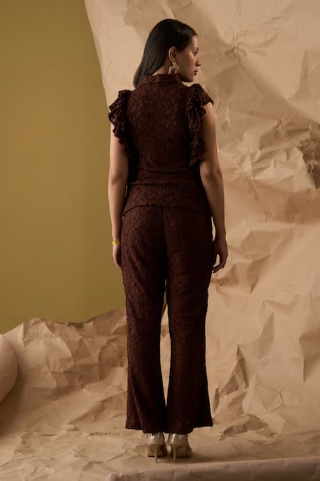 Brown shirt featuring ruffled sleeves and collared neck with paisley lace embroidery. Paired with matching lace embroidered pant.