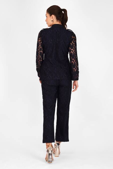 Blue shirt featuring floral lace detailing with a collared neckline and full sleeves. Paired with matching pants that have pockets.