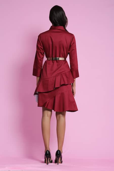 Maroon layered ruffle shirt dress featuring a shirt collar and long sleeves. Paired with a metallic belt for added elegance.