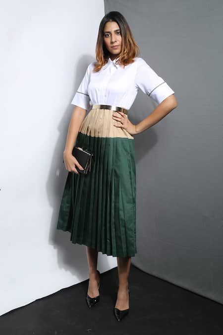 Green pleated shirt dress featuring contrast panels and piping on sleeves