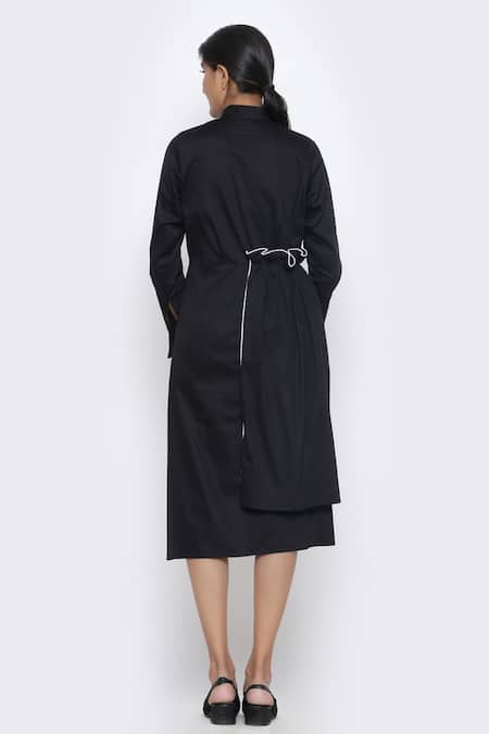 Black Cotton Satin High Neck Frill Detail Midi Dress