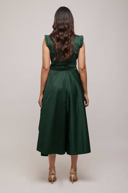 Green Cotton Satin Collared Pleated Sleeve Jumpsuit