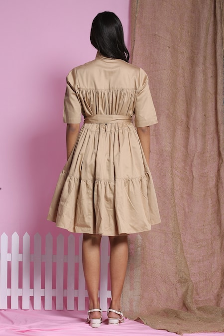 Buy_Escape By Aishwarya_Gold Cotton Satin High Neck Three Tier Drama Dress With Belt _Online_at_Aza_Fashions