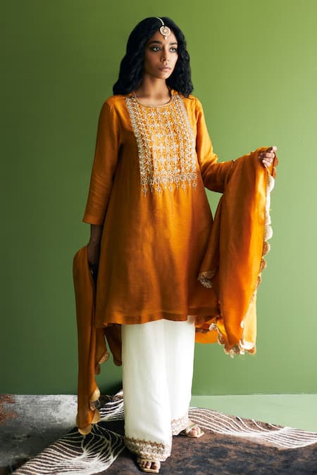 Mustard kurta with floral, cutdana embroidered bodice. Paired with flared pant & dupatta.