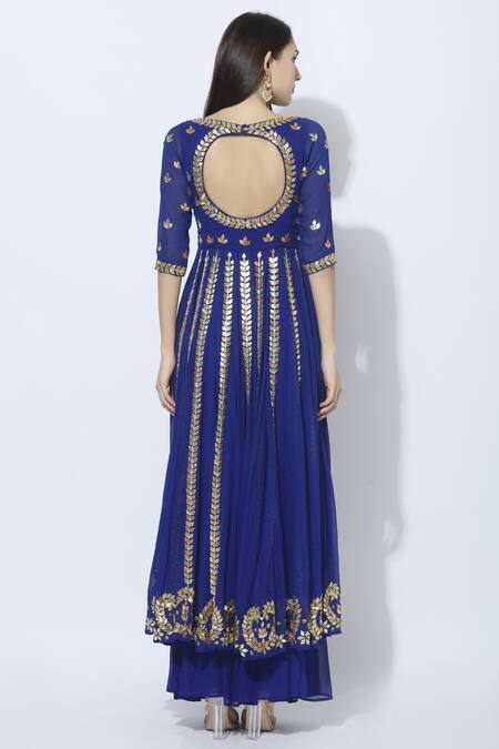 Blue flared anarkali with gota patti & sequin embroidery. Comes with matching kalidar palazzo & net dupatta.