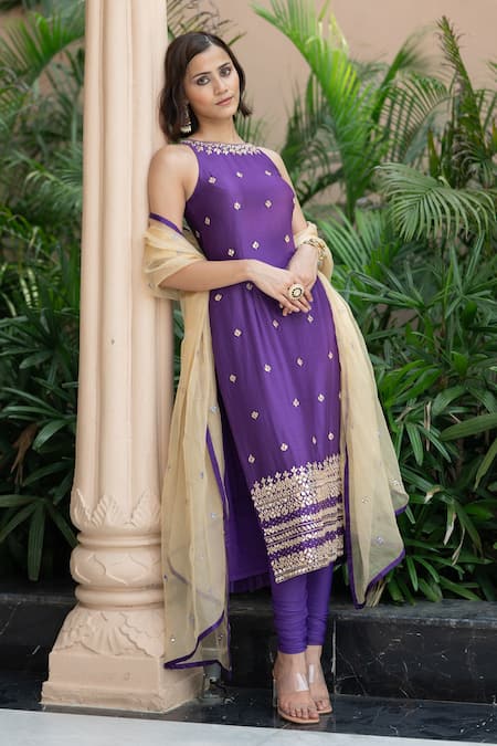Purple kurta featuring mirror embroidery and a round neckline. Paired with churidar and a dupatta.