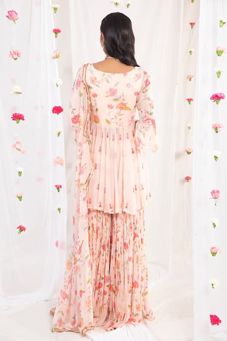 Pink Organza, Georgette, Semi Crepe Floral Motifs V Neck Print Kurta Sharara Set