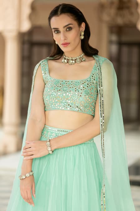Aqua blue lehenga featuring mirror embroidery on the waistband and an attached cancan. Paired with a padded blouse and a flowing cape.
