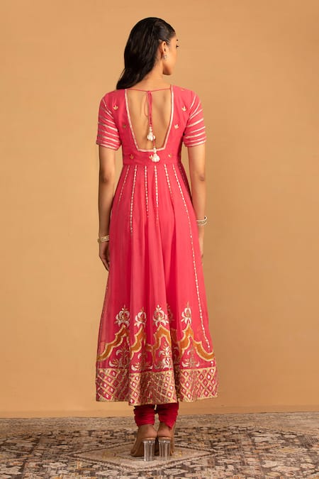 Peach pink anarkali featuring gota work and organza patchwork embroidery. Paired with a coordinating churidar and dupatta.