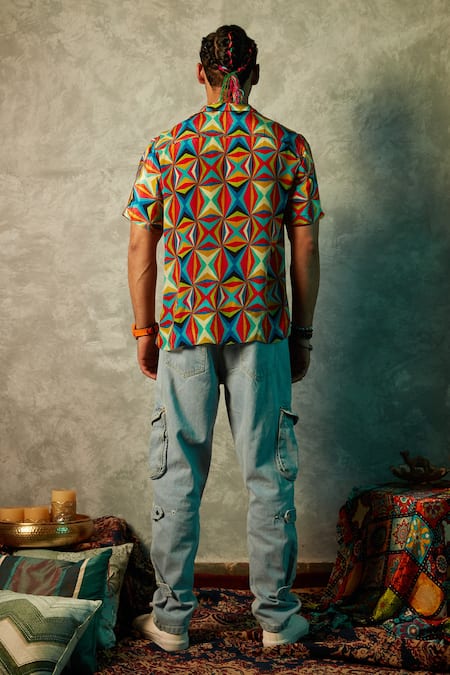 Multi color shirt featuring a big square print design, half sleeves, and a collar