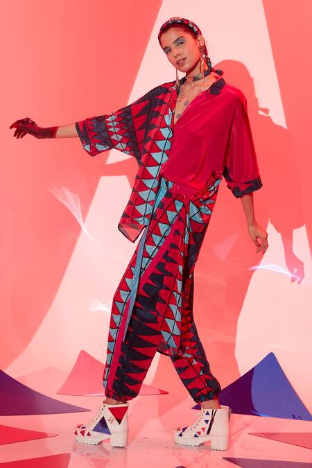 Multicolor high low hem shirt featuring geometric motifs on one side and a plain design on the other