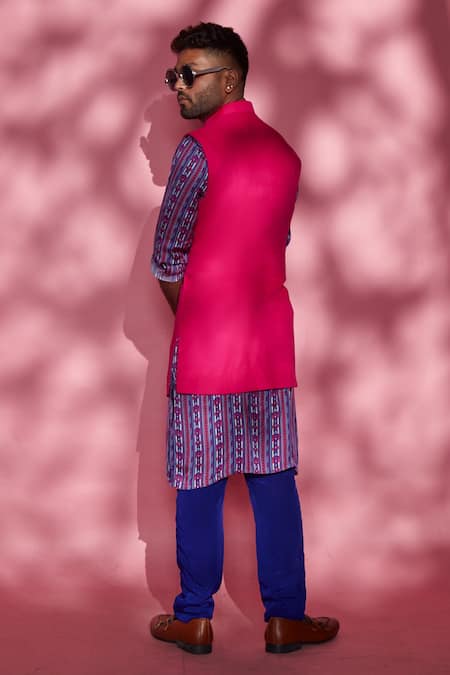 Pink bundi with high low hem and welt pocket in front.