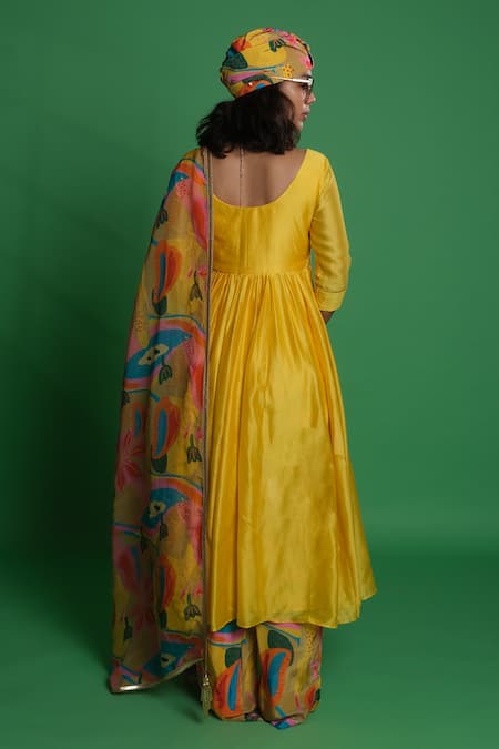 Yellow embroidered anarkali crafted from dupion silk
