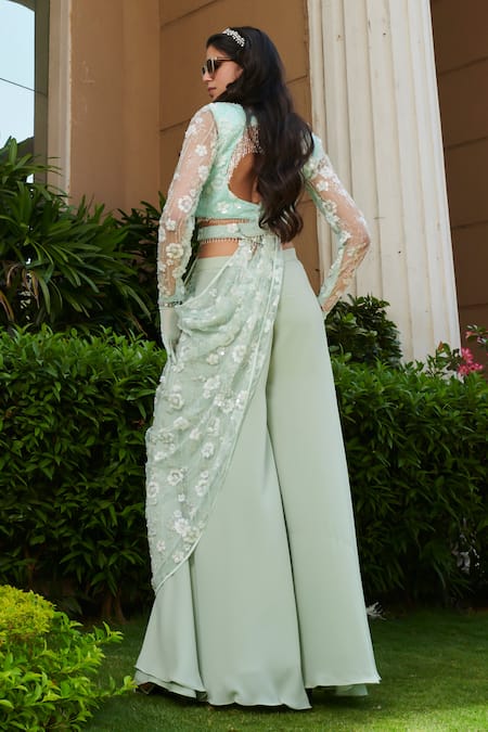Mint cape featuring all-over sequin and bead embellished flower patterns. Paired with an embellished overlap panel slit skirt and padded bralette.