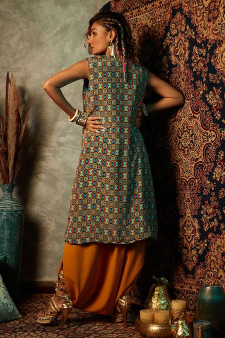 Multi Color Viscose, Crepe Embroidery Open Neck Small Square Print Long Jacket