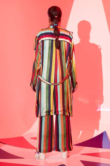 Multi color long jacket featuring a stripe print, spread collar, and overlap panels