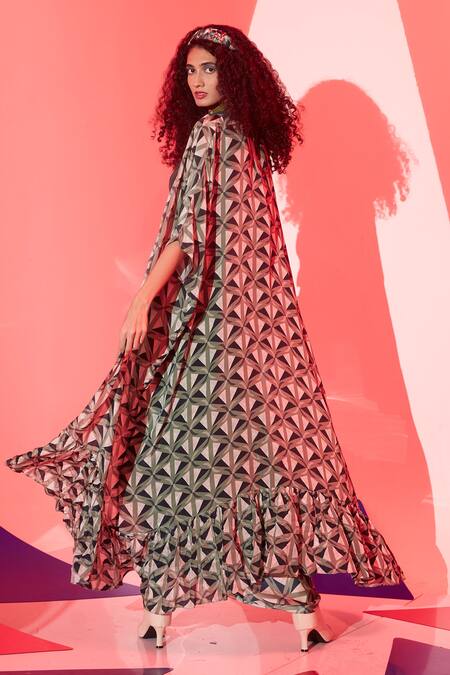 Multicolor open front cape featuring an all-over geometric print and frill at the hem