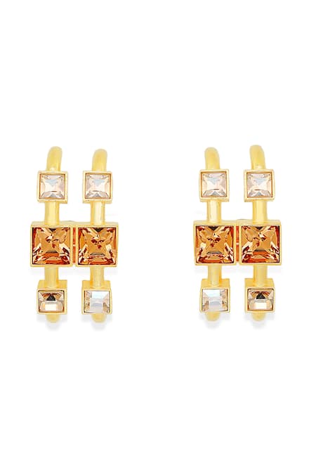 Gold plated geometric carved stud earrings featuring stone embellishments