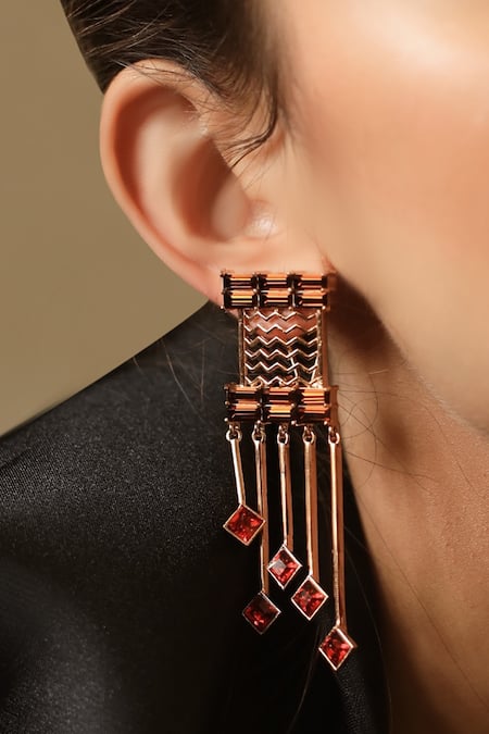 Gold-tone danglers featuring cutwork detail and encrusted brown Swarovski baguettes