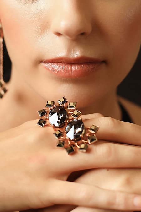 Gold-tone statement ring featuring geometric motif cutwork detail and encrusted grey Swarovski crystals
