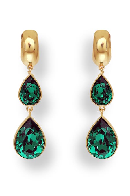 Gold plated finish with tear drop design, Swarovski crystals in emerald green, Push back clasp for easy wear