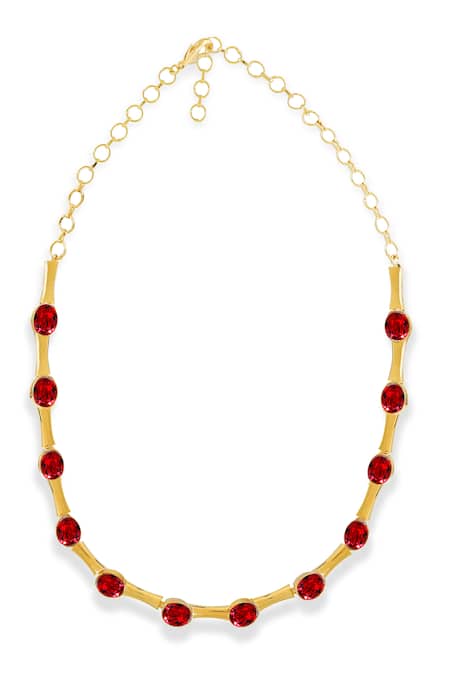 Red choker featuring gold plating with round-cut red stones
