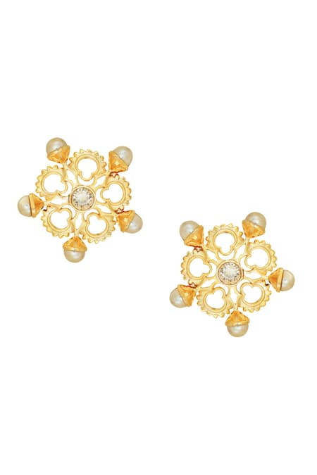 Gold stud earrings featuring floral cut work design with pearl and cushion cut Swarovski crystal stone embellishments