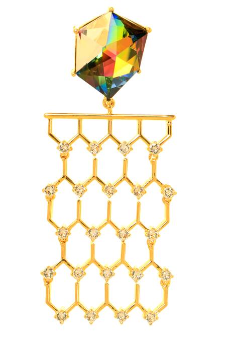 Gold honeycomb shaped danglers featuring round Swarovski crystals and a volcano z calvsi designer cut stud