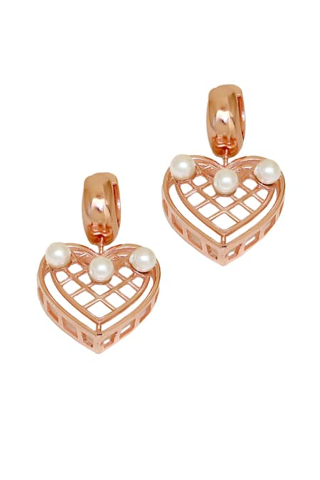 Rose gold plated heart shaped cutwork earrings featuring embellishments of Swarovski and pearls