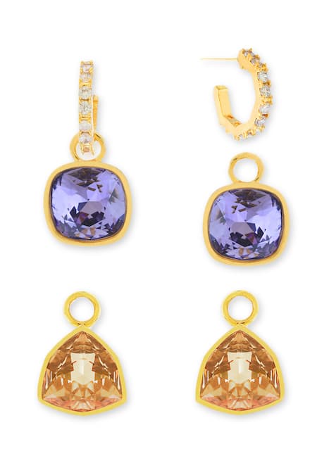 Purple and multi color earrings featuring a gold plating and brass material. Includes two pairs of earrings with distinct designs.