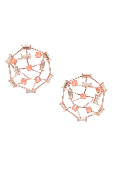 Orange round shaped stud earrings featuring Swarovski crystal embellishments. Designed in a geometric shape with a push back clasp closure.