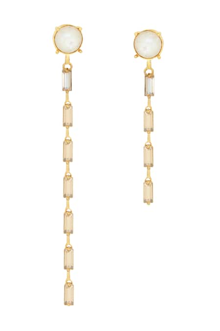Gold toned dangler earrings featuring geometric cut work shapes and asymmetric chains