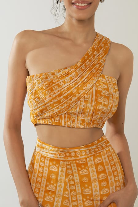 Yellow one shoulder padded blouse featuring contrast white lotus stripe print and intricate pleated details. Paired with printed flared bottom pant.
