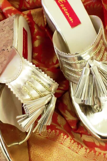 Gold wedges featuring cutwork border straps, braided detail, and multi-tassels