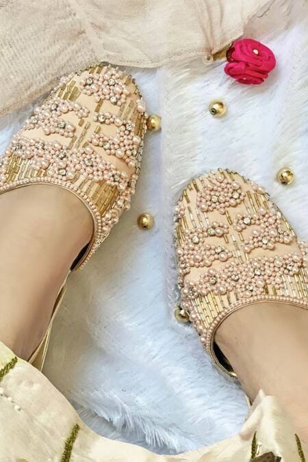 Peach mules featuring bead and cutdana embellishments with a closed toe design