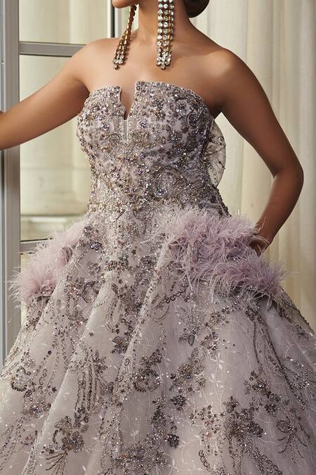 Pale mauve off-shoulder gown in tulle base fabric, flared silhouette, featuring thread and zardozi embroidery, embellished with feathers, side pockets and back statement ruffle detailing.