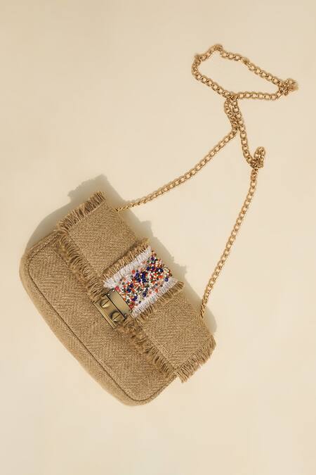 Multi-colored bead embellishment on the center band, Raw jute fiber fringe detail, Attached sling chain for versatility