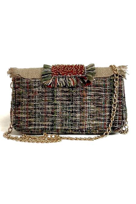 Magnetic flap closure for easy access., Fringed edges for a trendy look., Gold undertones in embellishments add a touch of elegance.