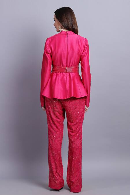 Fuschia chanderi top with full sleeves. Paired with floral embroidered sequin motif pant & belt.