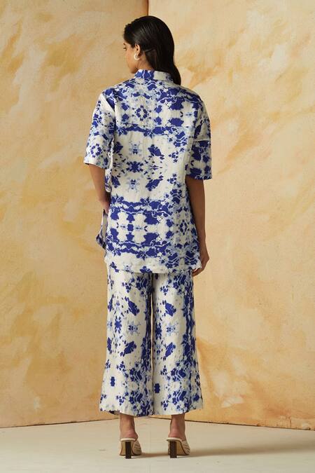 Blue Linen Satin Printed Abstract Straight Collar Evelyn Pant Set
