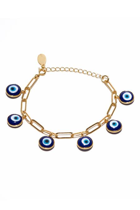 Gold chain link bracelet featuring blue evil eye charms