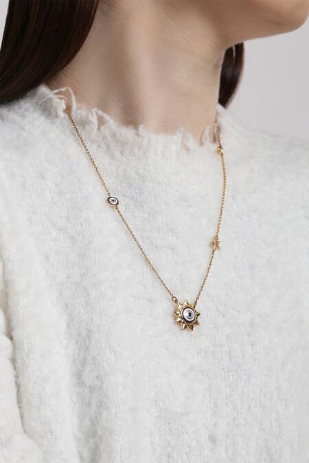 Gold pendant necklace featuring an enamel evil-eye detail and carved star-shaped motifs