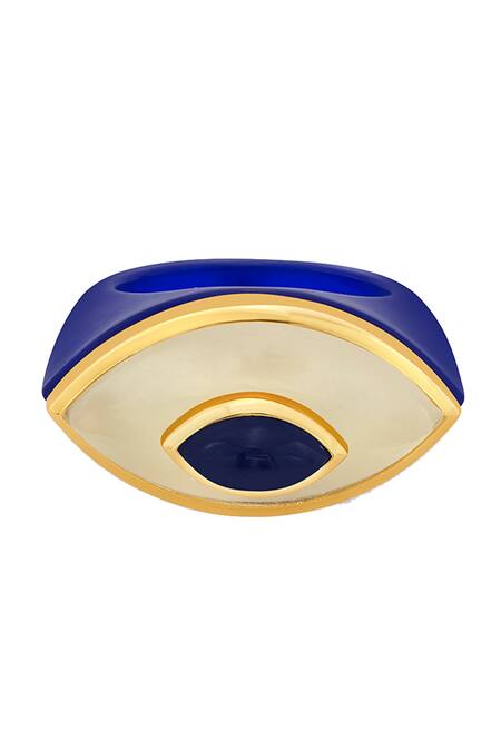 18kt gold plated band fitted rings in blue resin with a carved rock crystal evil eye and blue sapphire doublet at its centre.