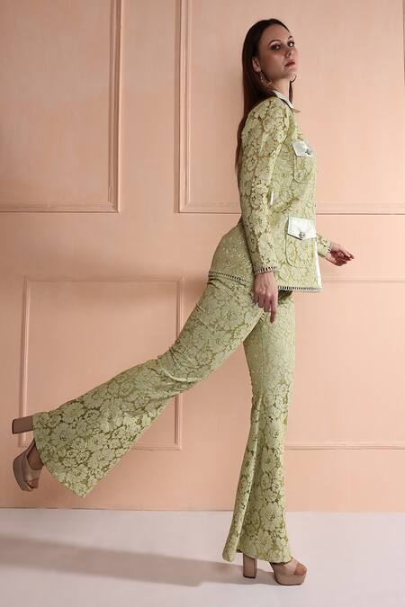 Green lace work shirt with flap pockets, loop borders & placement embroidery. Paired with lace work bell bottom pant.