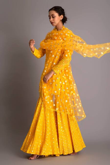 Yellow straight short kurta with all-over mirror work in checkered pattern. Comes with embellished sharara pants & dupatta.