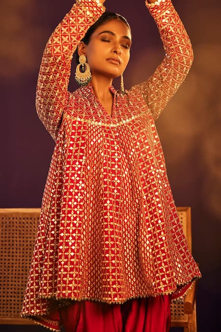 Red flared kurta featuring intricate zari embroidery and a mandarin collar. Paired with a coordinating tulip pant for a complete look.