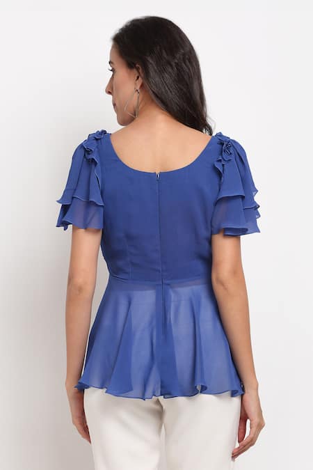 Electric blue peplum top featuring floral thread embroidery and ruffle sleeves