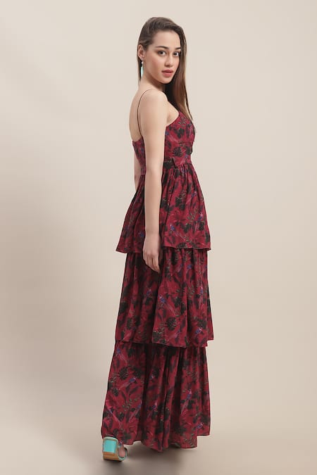 Red maxi dress featuring an all-over jungle print with asymmetric ruffled tiers