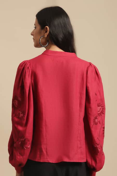 Red top featuring thread embroidery in floral pattern on the sleeves
