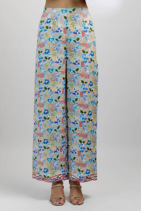 White boxy top featuring a swan print and panelled neckline detailing. Paired with flared pants designed for a relaxed fit.
